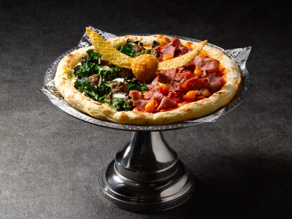 そして今回の特別企画『ホグワーツからの招待状』では、期間限定のかわいいフードもたくさんあります!中でもおすすめしたいのが、組分け帽子型のチョコレートタルト。ホグワーツ魔法魔術学校のそれぞれの寮をイメージした色のカスタードクリームがランダムで入っているんです。食べてみないとどの色が入っているかわからない仕組みになっているので視覚的な楽しみもありつつ、食べ進めながらドキドキワクワクできるのですごくおすすめです。他のフードメニューにはカボチャパイだったり、ピザだったり、比較的大人数で食べられるメニューもあるので、家族みんなで来ても楽しいだろうなと思います。