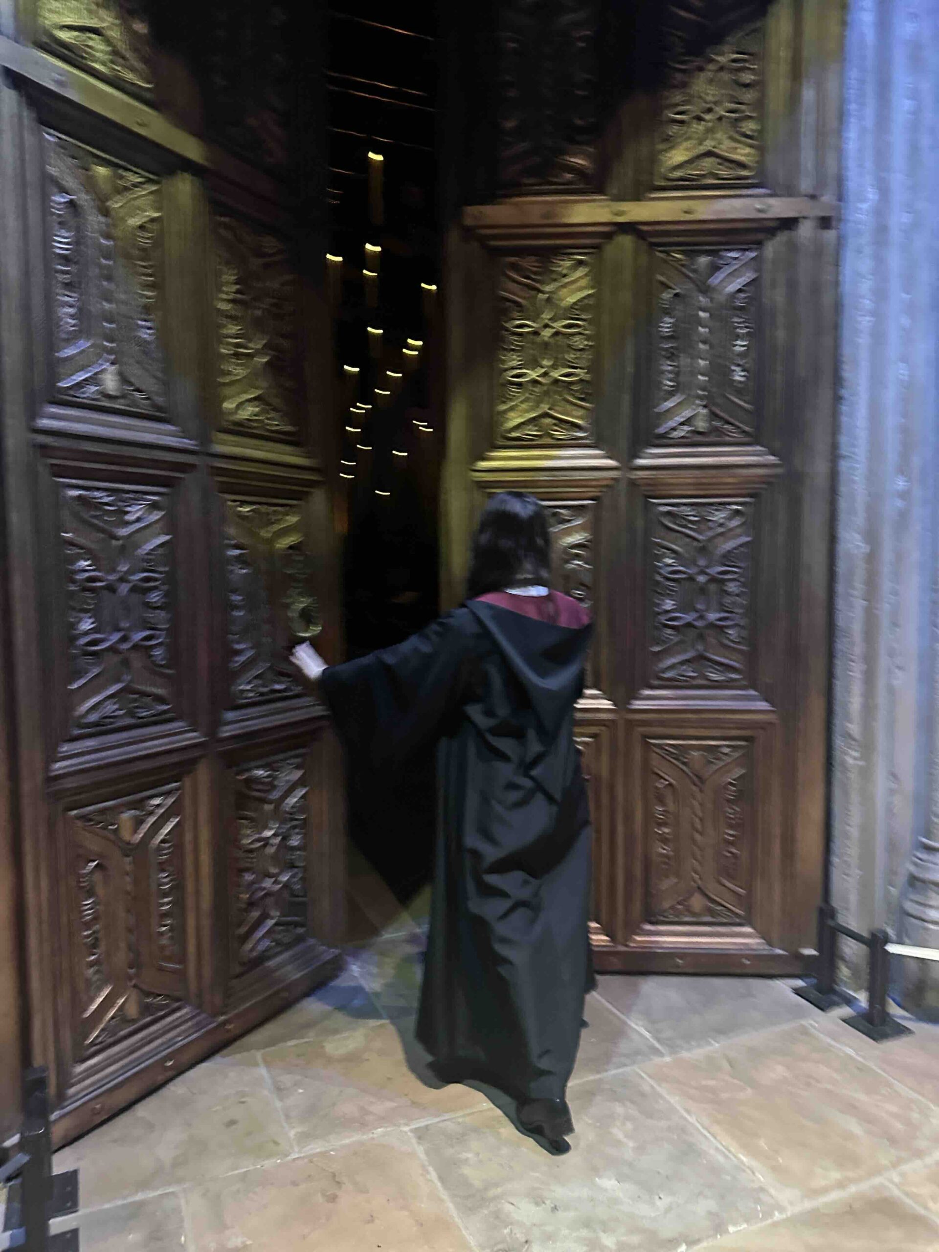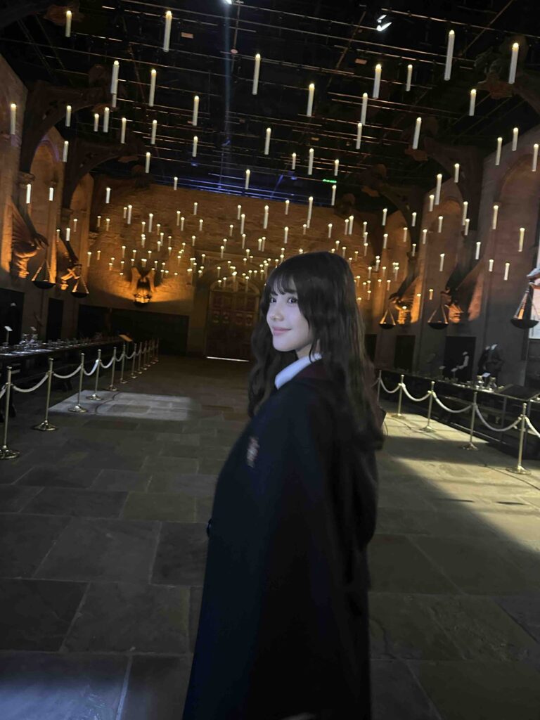 たくさんのキャンドルに囲まれてフォトジェニック。教壇には組分け帽子が登場して、<組分けの儀式>の演出を目の前でみることができるよ。