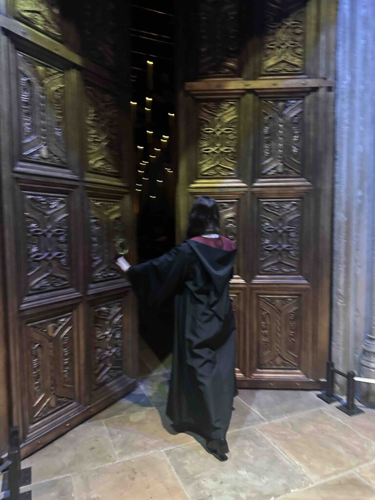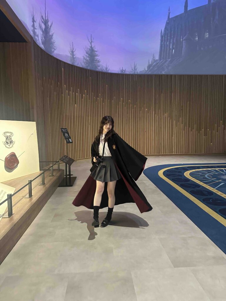 主人公のハリー・ポッターが所属する寮・グリフィンドールのローブを羽織って、ハリーの杖もゲット。