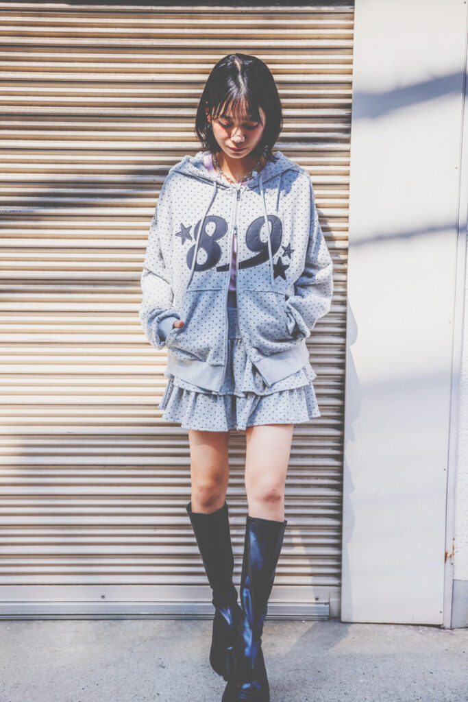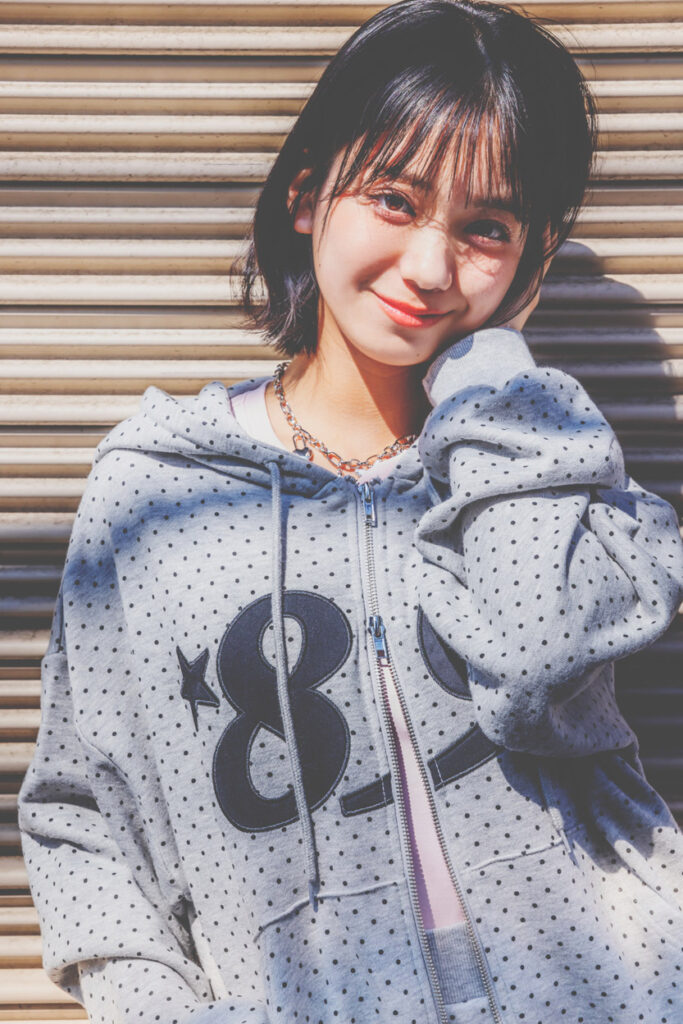 「めっちゃかわいかった!街中でもセットアップ着ている人は多いけど、ダブルジップのアイテムは特にアレンジせず普通に締めがちだと思うんです。今回のピンクのセットアップはインナーを見せるように下のジップを大きく開けることにこだわっています。私がみんなに伝えたい“地元でも着られる最新のおしゃれ”を取り入れるっていうイメージとすごく合ってて嬉しかった!ドット柄を選んだ理由は、流行るって言われていたタイミングで私の耳にも入ってきてたから。おしゃれが好きで突き詰めていくと、自然と情報が入ってくるのかも!?」