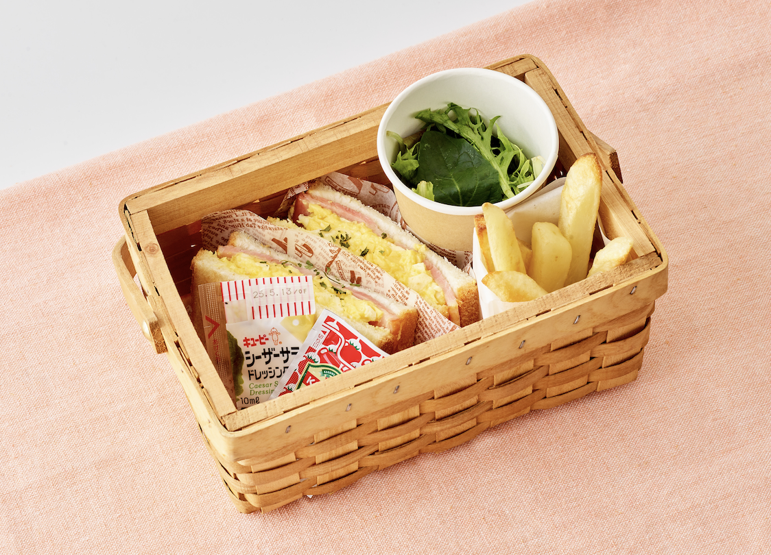 食パンにサンドされているのは、スクランブルエッグとベーコン。 口に入れると、まず卵のふわとろ食感にびっくり! そこに追いかけてくるベーコンのスモーキーな旨みは、もちろん相性抜群。 ミニサラダとポテトまで付いてくるボリューミーなセットだよ。 かわいすぎるバスケットに入れてくれるから、芝生スペースでピクニック気分を高めるのがおすすめだよ♪