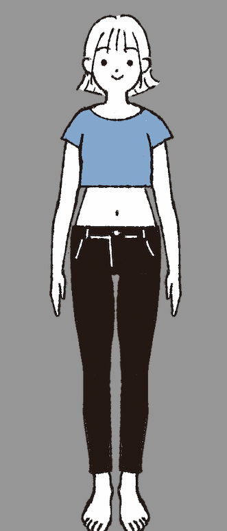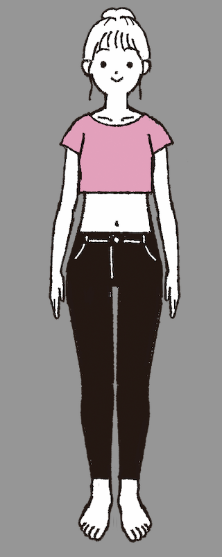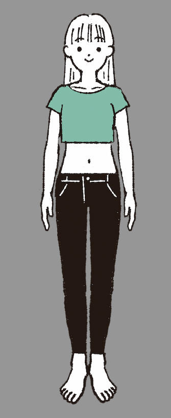 メリハリがある砂時計型のシルエットが特徴のストレート。肌にもハリがあって、盛りすぎないシックな着こなしが得意! 服のシルエットをそのまま生かすスタイルがハマるよ。かため素材・ジャストサイズを意識してね! デニムが似合うのも、ストレートさんの強み★ メリハリのある体型だから、ボーダーも堂々とした太ラインがオススメだよ。