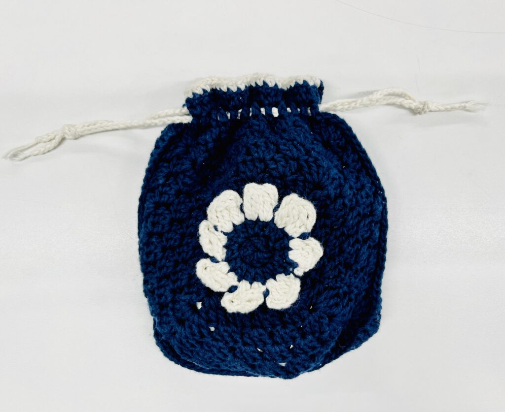 ユア「普通のアクリル毛糸ではなく、コットン糸をつかって日常使いしやすくしました! 巾着の部分と花びらが立体的になるように編んだところがユア的にこだわったポイントです!」