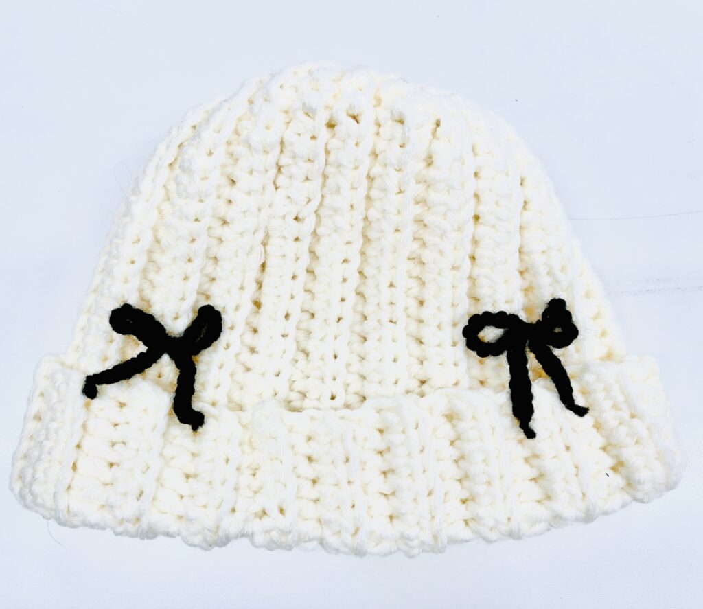 ユア「リボンつきの白ニット帽は、一度完成させたけど頭のサイズが合わなかったので、毛糸を全て解いて全部編み直したんです。被るのはスノボに行く時なんですけど、オシャレに被りたかったのでバレエコア感を出すために黒のリボンを毛糸で編んでつけました! もう一つのニット帽は毛糸の素材にこだわったよ〜! この毛糸が欲しくて毛糸屋さんを5店舗くらいまわりました。自分が好きなようにアレンジできるから、やっぱり編み物って最高!!!」