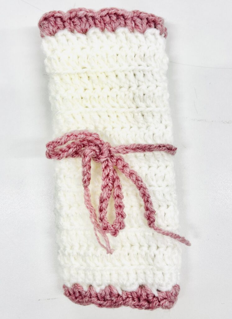 ユア「これは<かぎ針ケース>です^^ ガーリーな雰囲気にしたかったので、ピンクと白の毛糸でまとめました♡ ピンクの毛糸はダイソーの“メランジトリコ”。春の新作の毛糸です!」