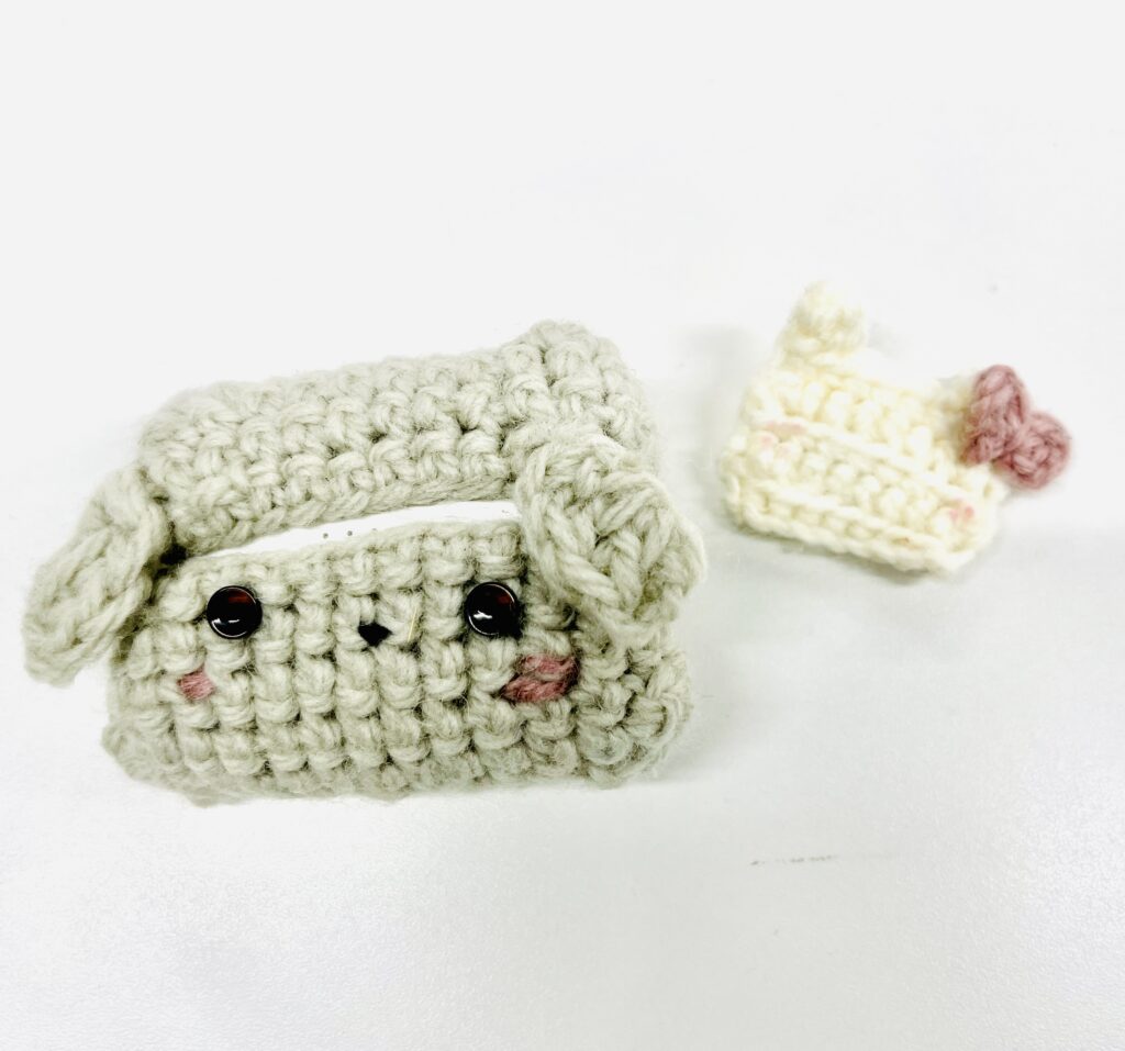 ハナ「イヤフォンケースは、イヤフォンサイズとしっかり合うようにこまめに確認しながら編みました。目の部分は最後、糸で縫いつけています! これは一番簡単で、顔のカーブしているところを意識すれば15分くらいで作れます!!! 初心者さんにもおすすめ。お気に入りのピンクのほっぺは、実際にチークで色をつけたんです♪」