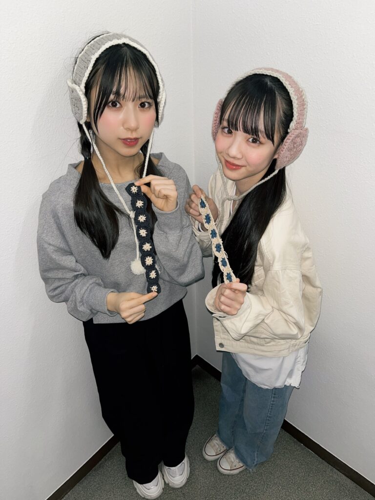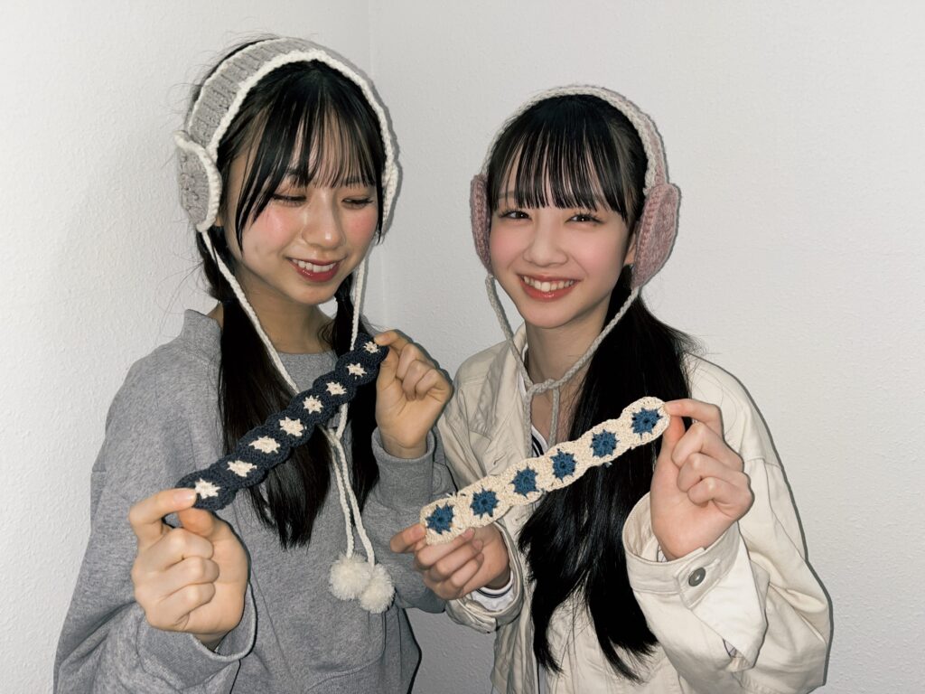 ユア「私は小さい頃から工作とか縫い物が好きだったから初めてみました! 次は、来年の冬に着ける用として黒のロングコートと合わせる“青いマフラー”を編みたいと思っています! “グレー色のフライトキャップ”とかも冬に向けて編みたいな♡」ハナ「いいね! 私が編み物を始めたきっかけは母! 手持ちバッグを編んでいて自分も手作りのバッグで出かけたいと思ったんだ★ 次は、夏に向けて水とうやペットボトルホルダーのようなものを編みたいと考えてるよ! 季節問わず楽しめる編み物って、やっぱり最高だね♡」