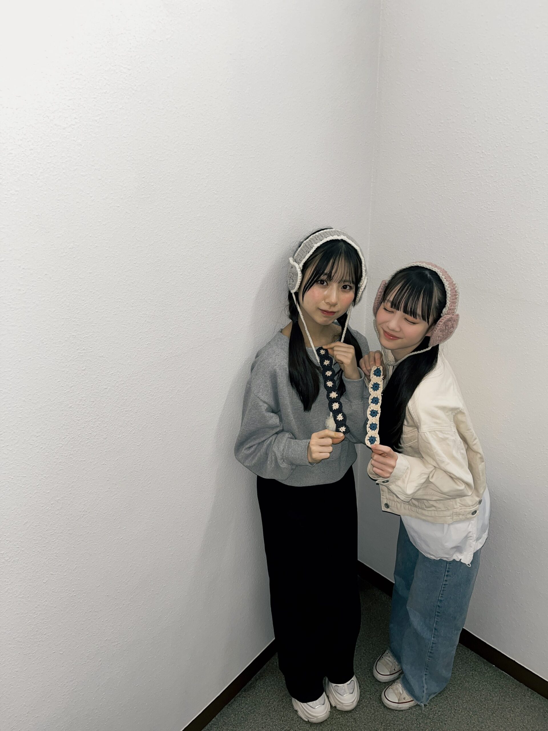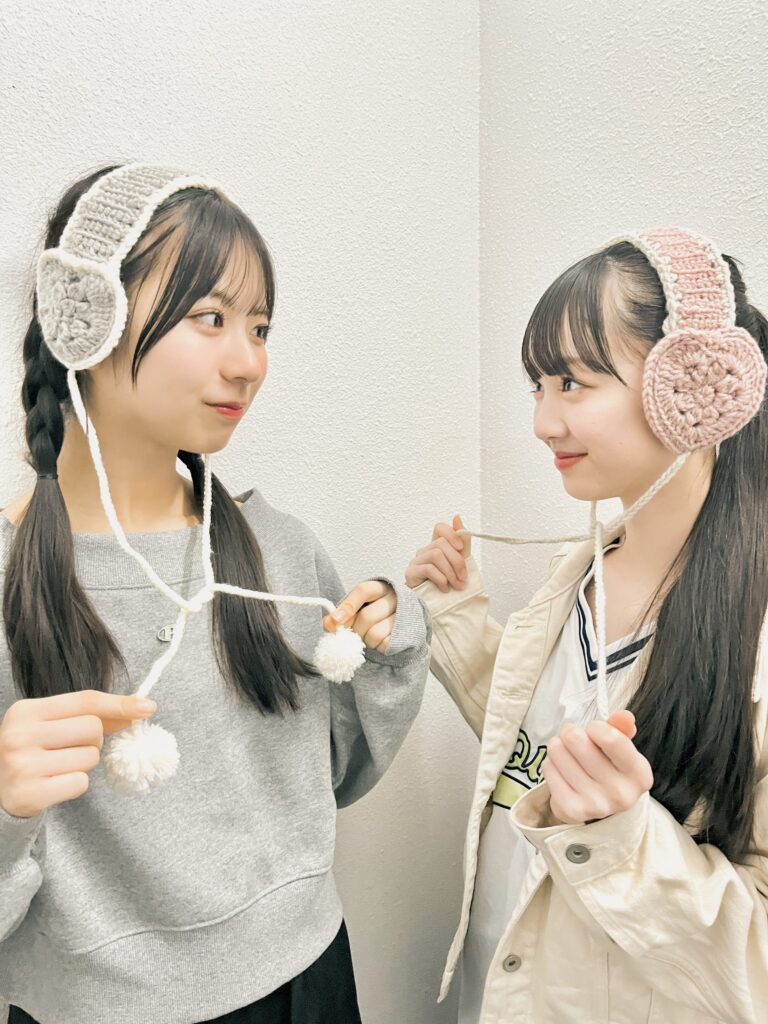 ユア「韓国っぽい雰囲気を出すために、グレーの毛糸で作ったところがポイント! 耳に当たる部分のハートは4枚編む必要があって正直大変でした! だけどどうしても綺麗に作りたくて、4枚完成させるまでに合計10回以上編んで、解いてを繰り返しました」ハナ「耳あての部分、難しいよね! 同じ力加減で編まないと変なハートになっちゃうんだよね。私もこのハートの部分を一番気をつけて編んだよ」