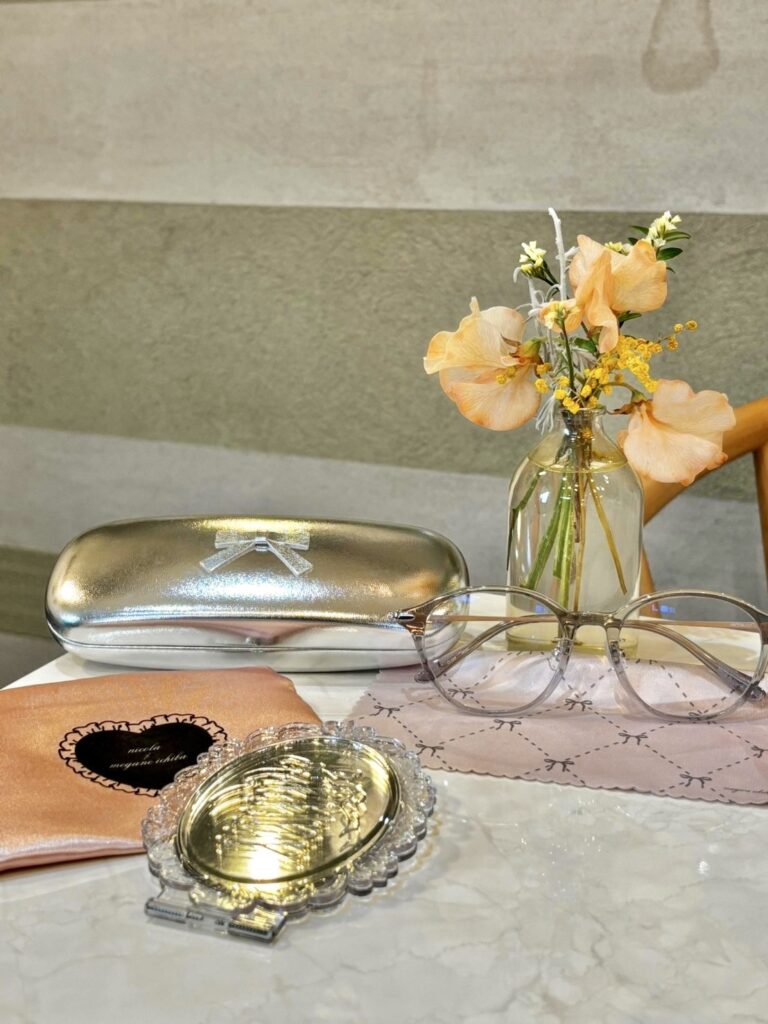 先着のノベルティとしてミラーとポーチもあります! メガネケース、メガネ拭きもこだわってニコモでたくさん話し合いしました! カフェに行ったり日常で使えるのでお気に入りです♡