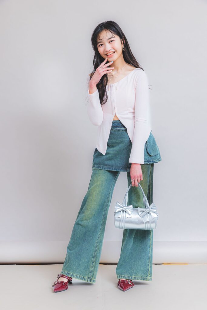 ユウリ☆トップス(ワンピースつき)¥17380/NOTYOURROSE(HANA KOREA) スカートつきデニム¥6050、バッグ ¥3289、パンプス¥5720/すべて SPINNS イヤリング¥330、チョーカー¥660、リングセット¥660/すべてラティス