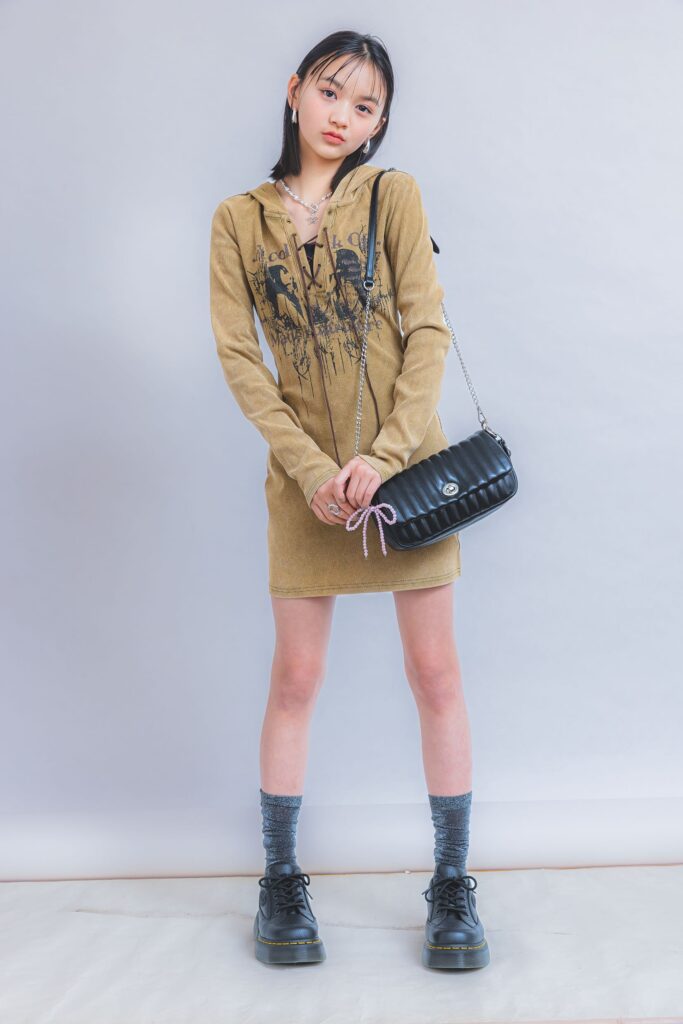 イチカ☆ワンピース¥6589、ネックレス(3本セット)¥880/ともにSPINNS イヤリング¥330、リング ¥330/ともにラティス バッグ¥7920/ギャレッツ 渋谷 109 店 シューズ¥25300 /ドクターマーチン