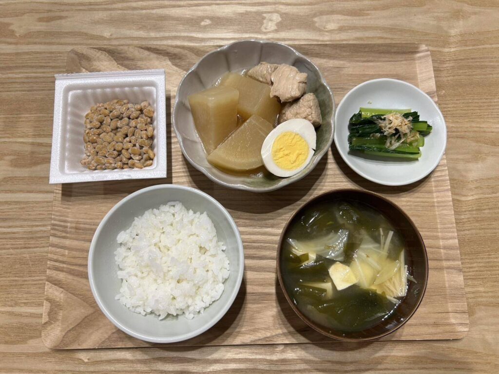 【2日目】夕食:煮物、味噌汁、納豆ご飯、小松菜のお浸し