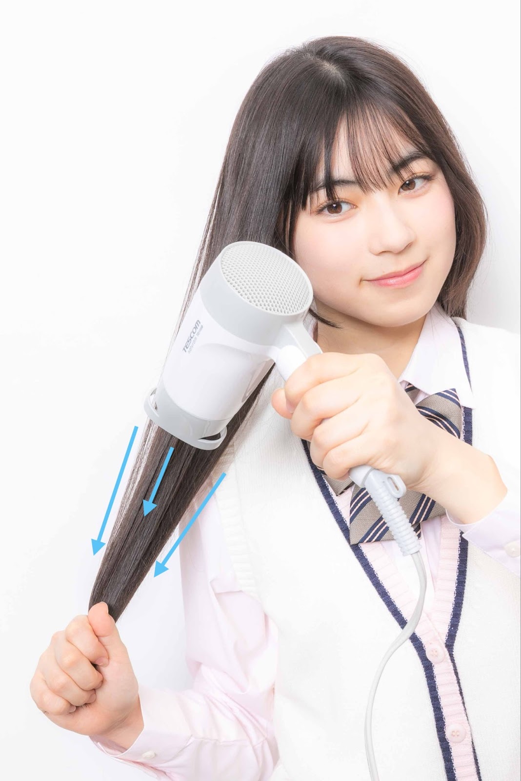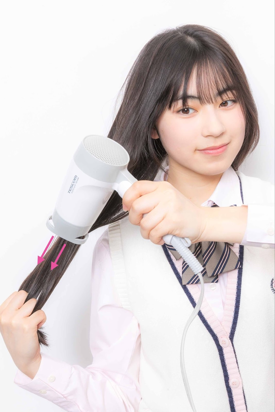 きれいなストレートを長い時間保つために、冷風を当ててしっかり髪を冷やしていくよ。毛先を引っぱりながら、ドライヤーの風を上から下に当てよう♪このときドライヤーの風量に要注意!強風だと変なクセがつくから、必ず弱風に設定してね。