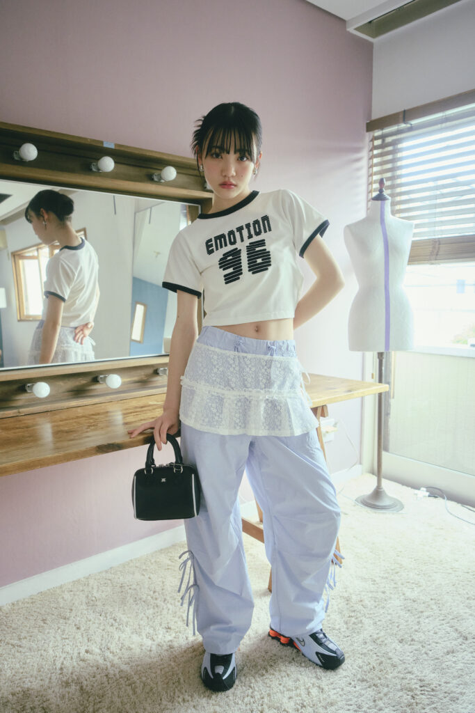 アンナ★エプロン巻きスカート¥9020/SETUPEXE(HANA KOREA) リンガーTシャツ¥2199/WEGO ナイロンパンツ¥2990/GU イヤリング¥330/ラティス バッグ¥5940/ギャレッツ渋谷109店 スニーカー¥212 30/ナイキ スポーツウェア(NIKE)