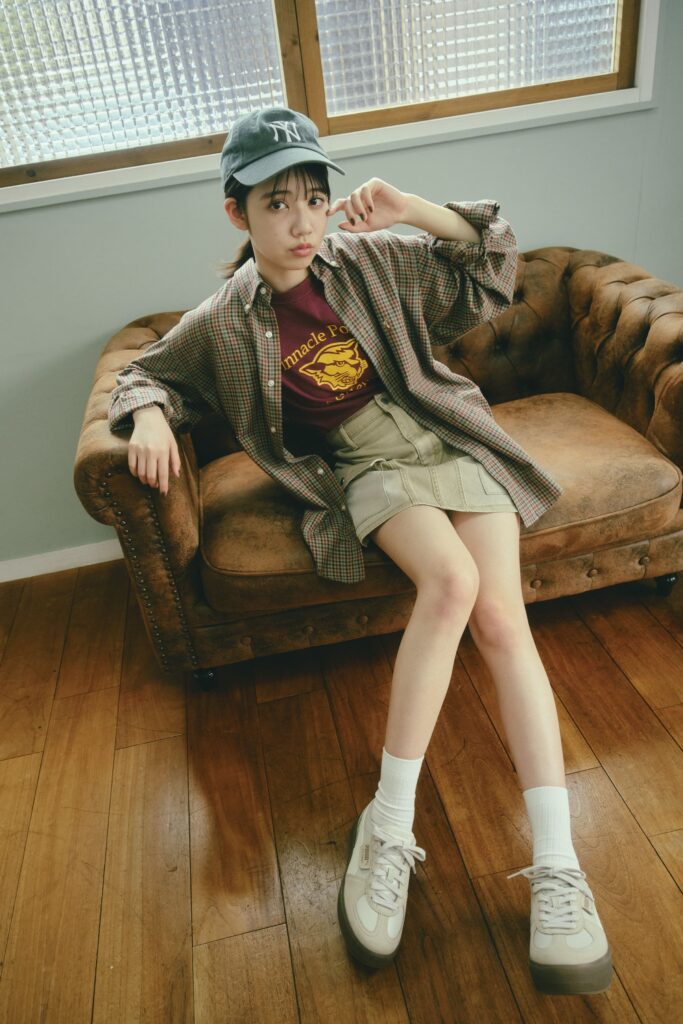 シャノン★チェックシャツ¥4950、Tシャツ¥3850/ともに原宿シカゴ 竹下店 カーゴスカート¥3299/WEGO キャップ¥4620/ニューエラ ソックス(3足セット)¥1188/チュチュアンナ スニーカー¥14850/プーマ