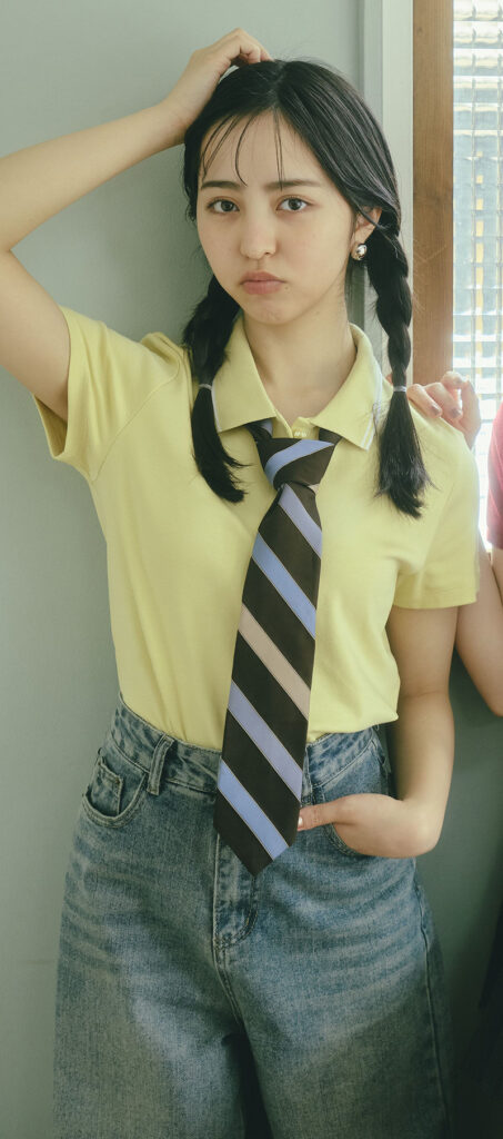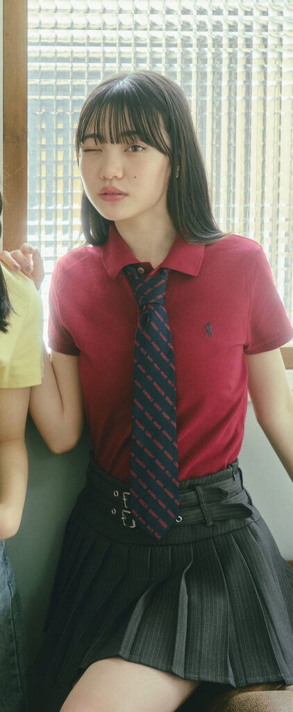 アンナ★ネクタイ¥4290、ポロシャツ¥3850/ともに原宿シカゴ 竹下店 プリーツスカート¥2640/高速ターミナル 原宿店
