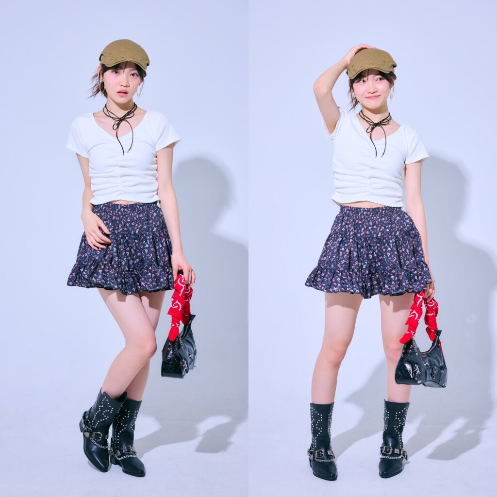 アンナ☆Tシャツ(チョーカーつき)¥1699、スカート¥1799/ともにGRL(グレイル) キャスケット¥1649、バッグにつけたバンダナ¥550/ともにWEGO イヤリング¥330/ラティス ネックレス¥880/パリスキッズ 原宿本店 バッグ¥5390/ANAP ブーツ¥4400/高速ターミナル 原宿店