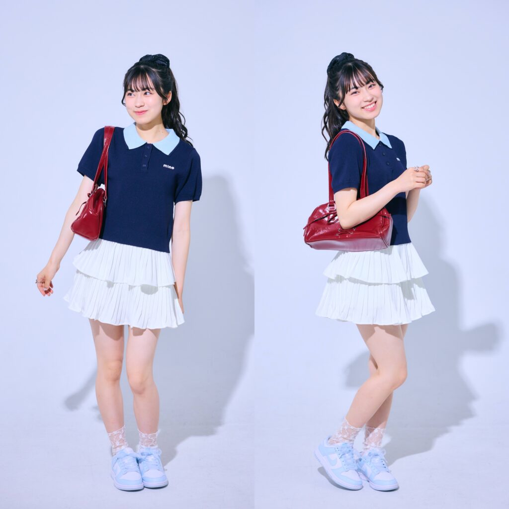 ヒヨリ☆トップス¥2499、スカート¥1999/ともにGRL(グレイル) シュシュ¥660、リング¥550/ともにパリスキッズ 原宿本店 バッグ¥3289/SPINNS スニーカー¥15400/ナイキ スポーツウェア