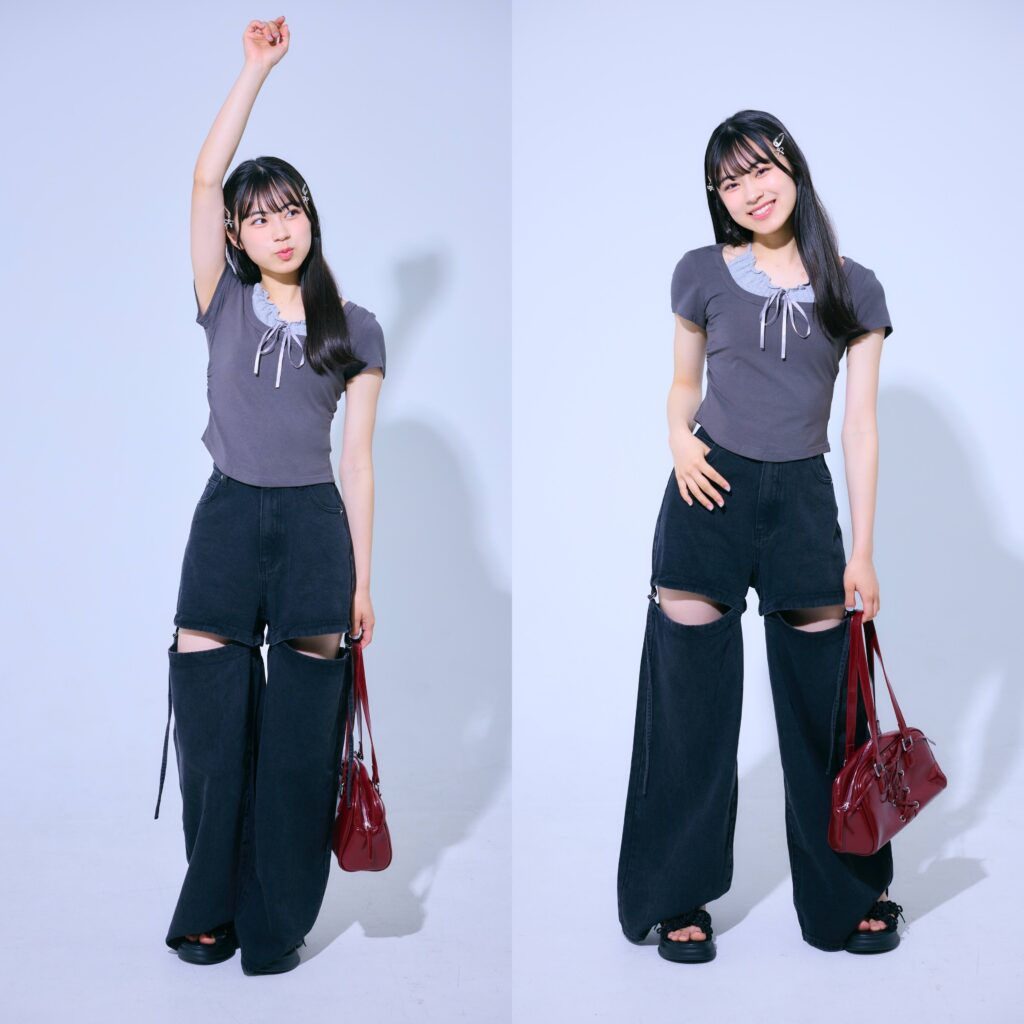 カラオケでアイドル曲を完コピしたいから、動きやすいデニム一択!トレンドのカット入りがおしゃれだし、カラーおさえめで浮かない地元コーデにぴったり。ちなみにカラオケの定番曲はきゅーすとの「かわいいだけじゃだめですか?」♡byヒヨリ