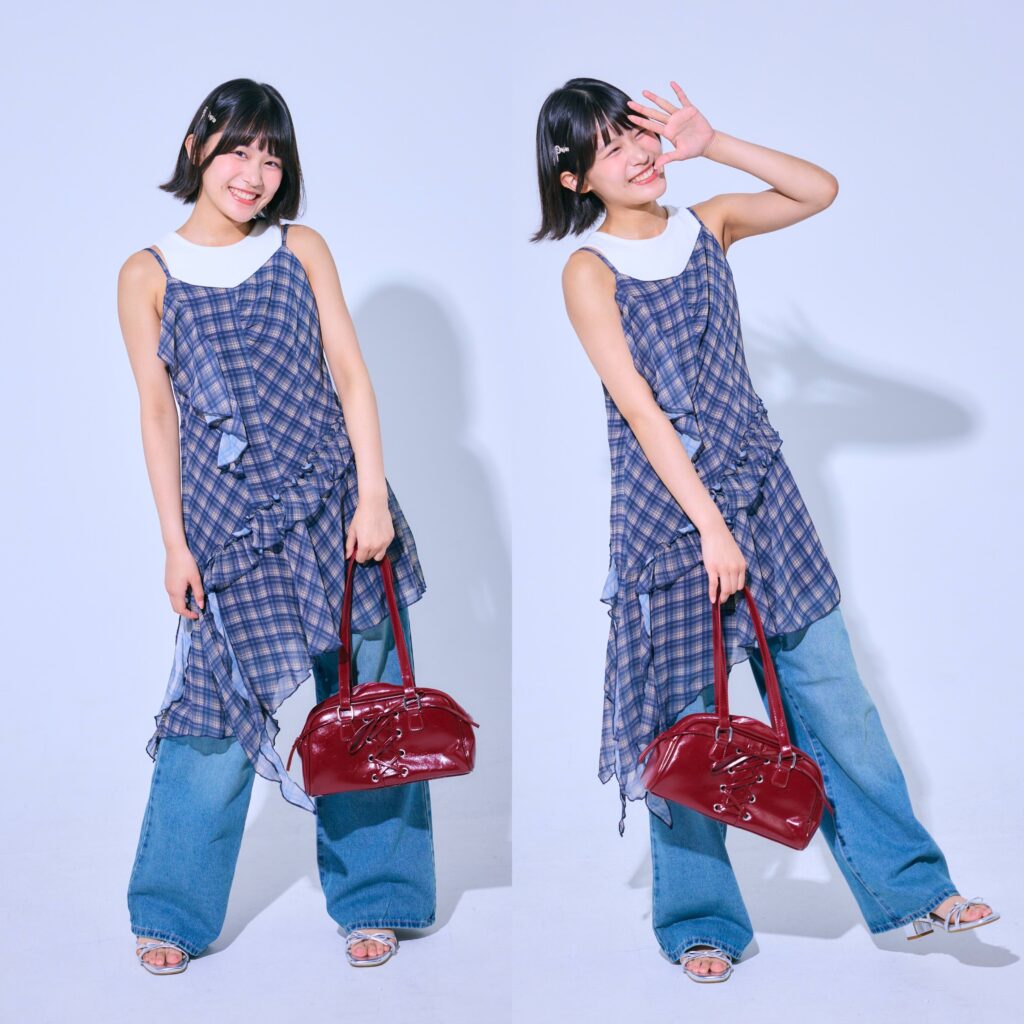 ヒメノ☆ワンピース¥2499、パンツ¥2099/ともにGRL(グレイル) ヘアピン¥550/パリスキッズ 原宿本店 バッグ¥3289/SPINNS サンダル¥7700/オリエンタルトラフィック(ダブルエー)