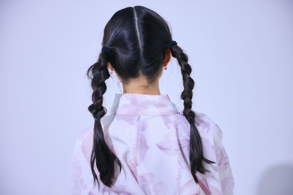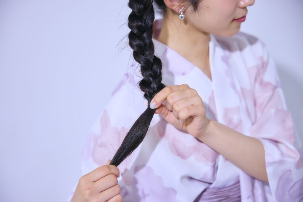 みつあみは肩までくらいで、毛先を長く残すよ。この部分がくらげの足になるよ♪