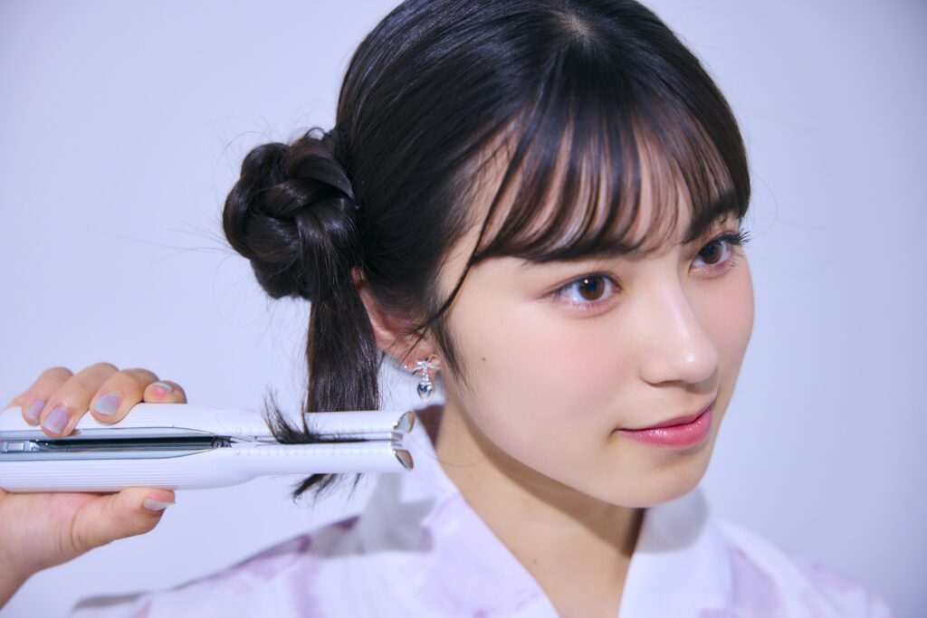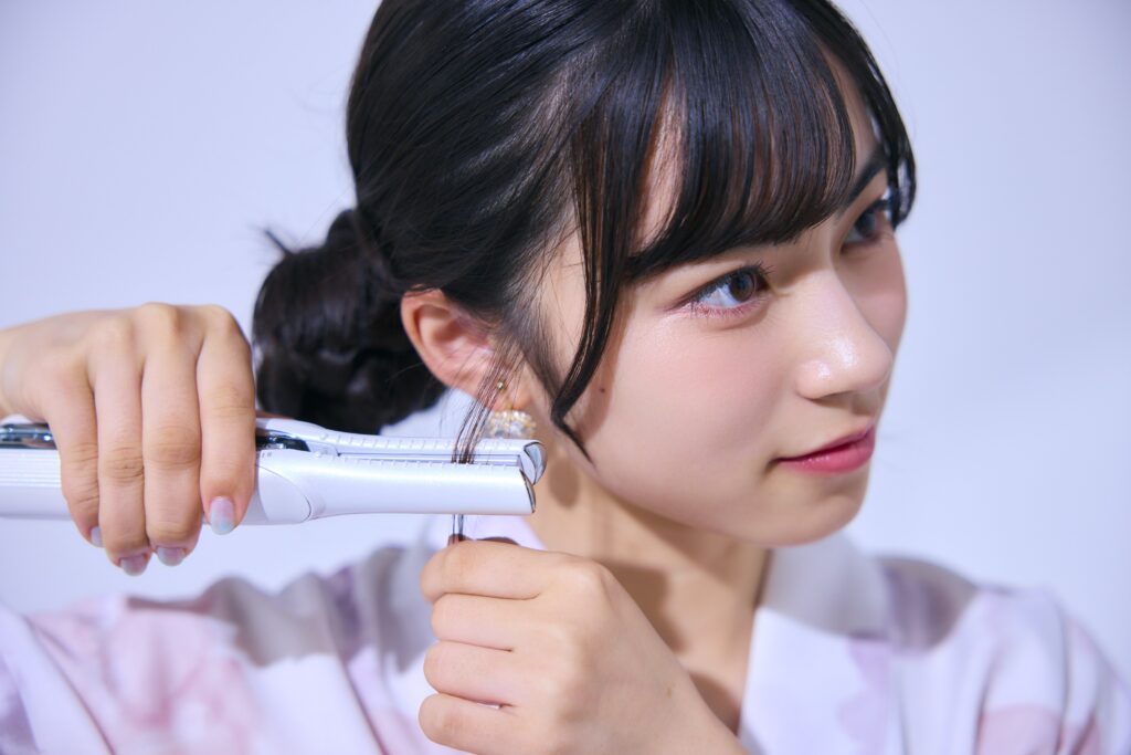 顔まわりの触覚部分を、ストレートアイロンで毛先が外側になるように巻くよ。