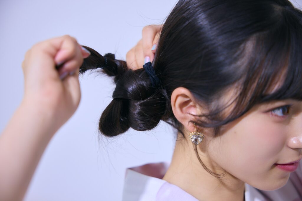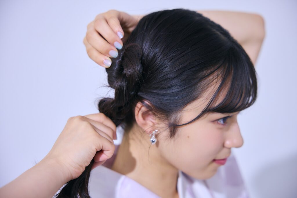 みつあみ部分を根元に後ろから前向きに巻きつけて、毛先が前に来るところでピンやゴムで固定するよ。初心者はゴムの方が上手くいきやすいよ!