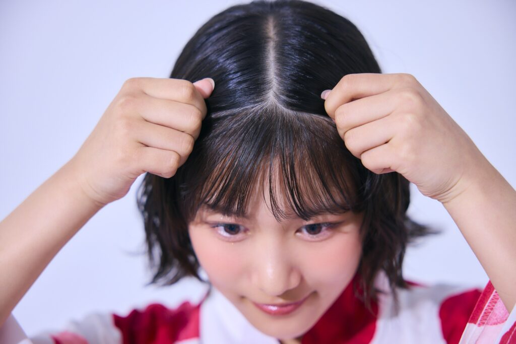 ヘアオイルを両手に取り、毛先→トップから髪全体→前髪の順でなじませるよ。前髪は手に残ってる分をつけるくらいがちょうどいい!