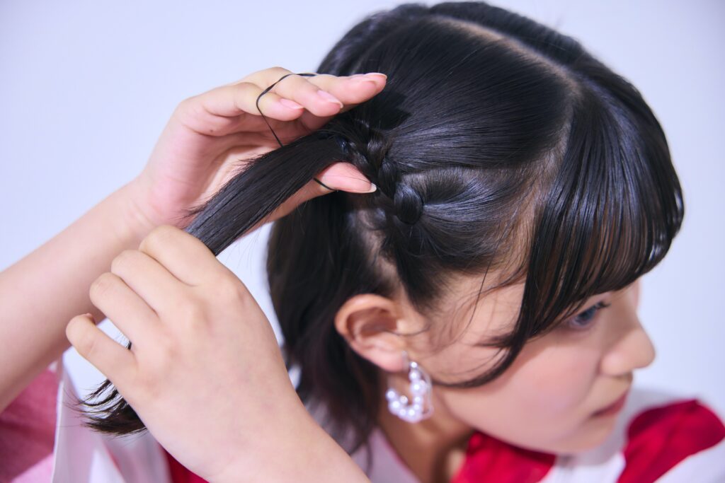 サイドの下側部分をみつあみにするよ。持ち上げた時に①で結んだゴムに届くところまであんだらゴムで結ぼう。