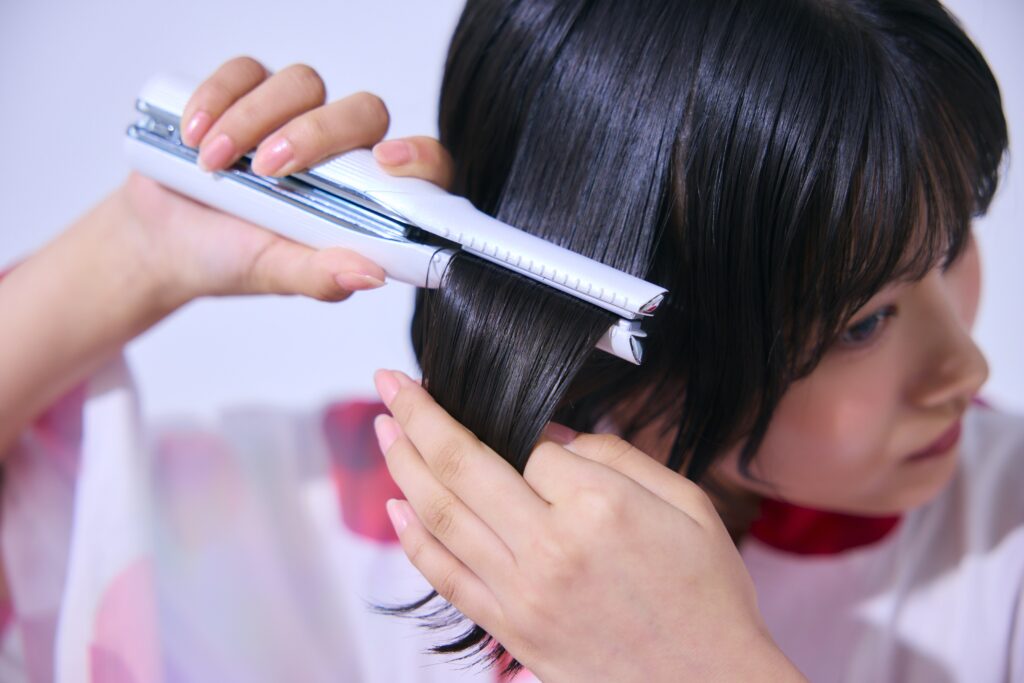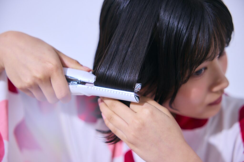 耳上の高さの髪をストレートアイロンで外側に巻き、ウェーブの始まりを作るよ。