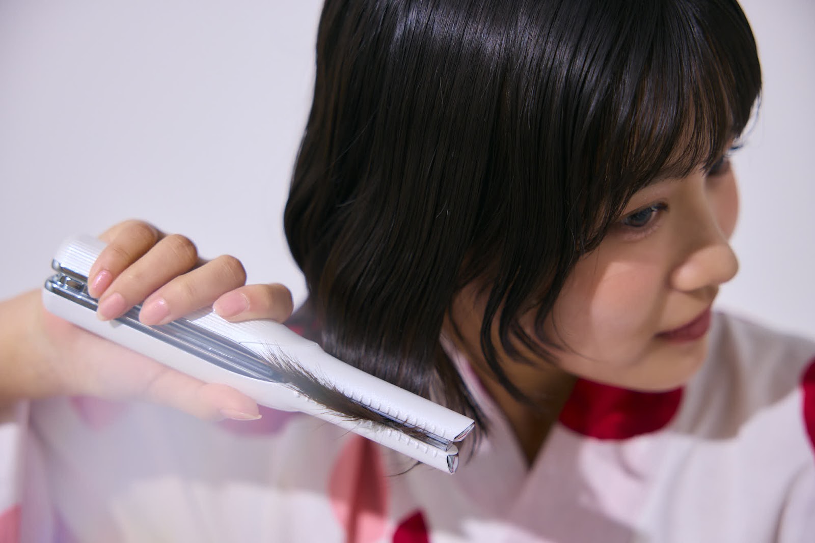 毛先を外側に巻いて外ハネにするよ。①~③はヘアアイロンを滑らせるようにして、一連の流れでやると自然な仕上がりに!