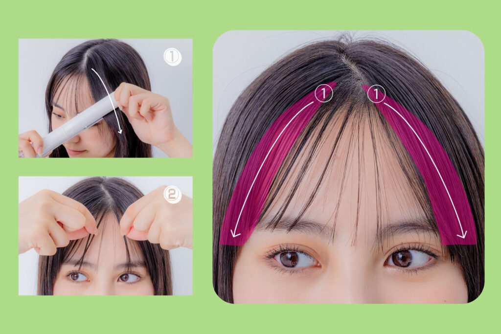 ①分け目を決めたら、少ない方の毛をすくい、サイドへ流すようにアイロンを通す。