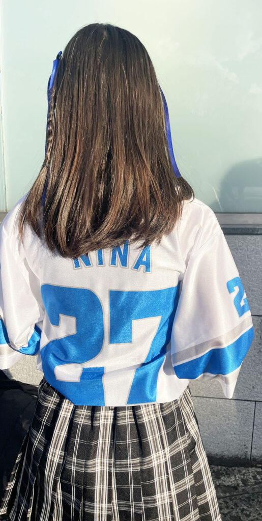 推し(NiziU)が公式発売したユニホーム型のTシャツ♡その日がチェックのスカートを履いてきそうな雰囲気の配信をしてたから「かぶるといいな♡」って願いながら過去のライブと全く同じ服、スカート、靴下、髪型をして行ったら、なんと丸かぶりでファンサがもらえた!最前列だったっていうのもあるかも♡(中1)