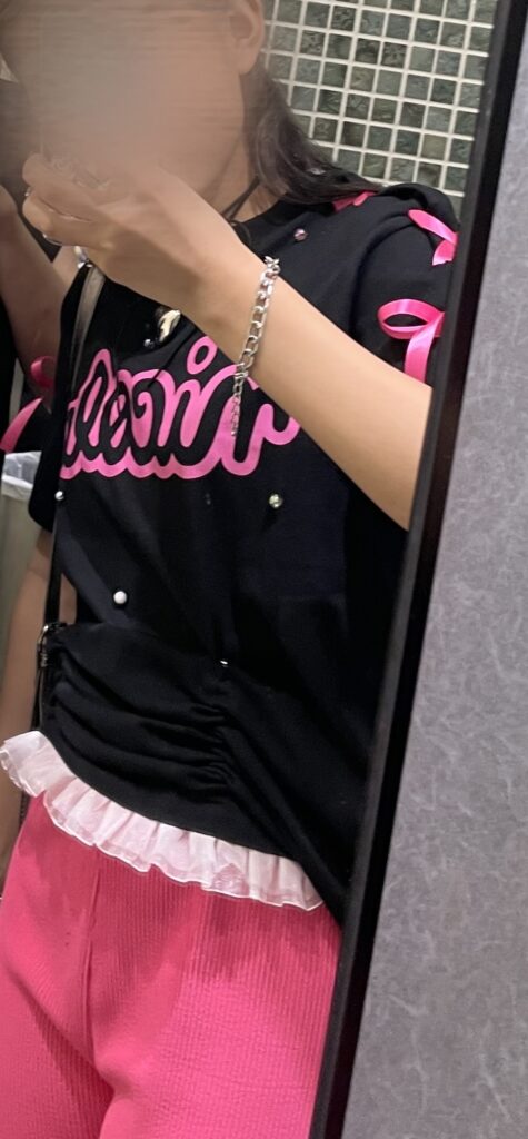 ニコラのイベントだったので、ニコラTシャツを自分らしくアレンジ!ロゴのピンクとリンクしてボトムスもピンクで合わせたよ!!こはなちゃんやみゆうちゃんにニコTのアレンジかわいい!って褒められました♡(中3)