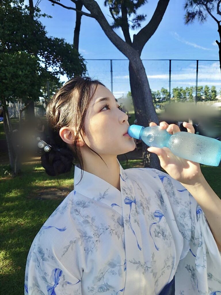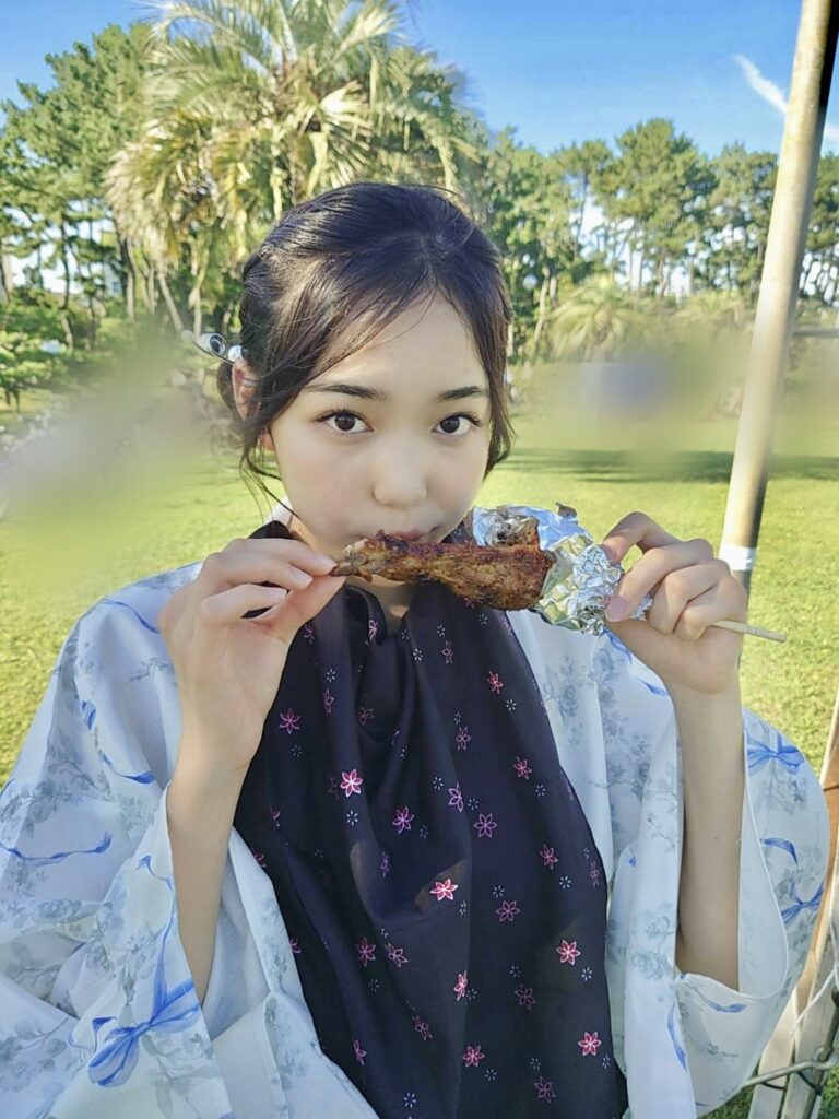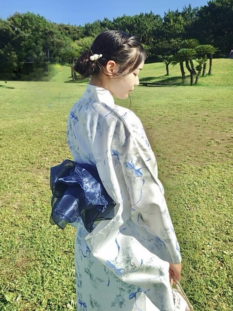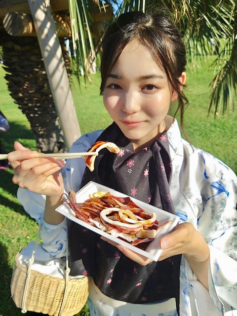 白い浴衣が汚れたら困るから和柄ハンカチをエプロンがわりにしたよ😙