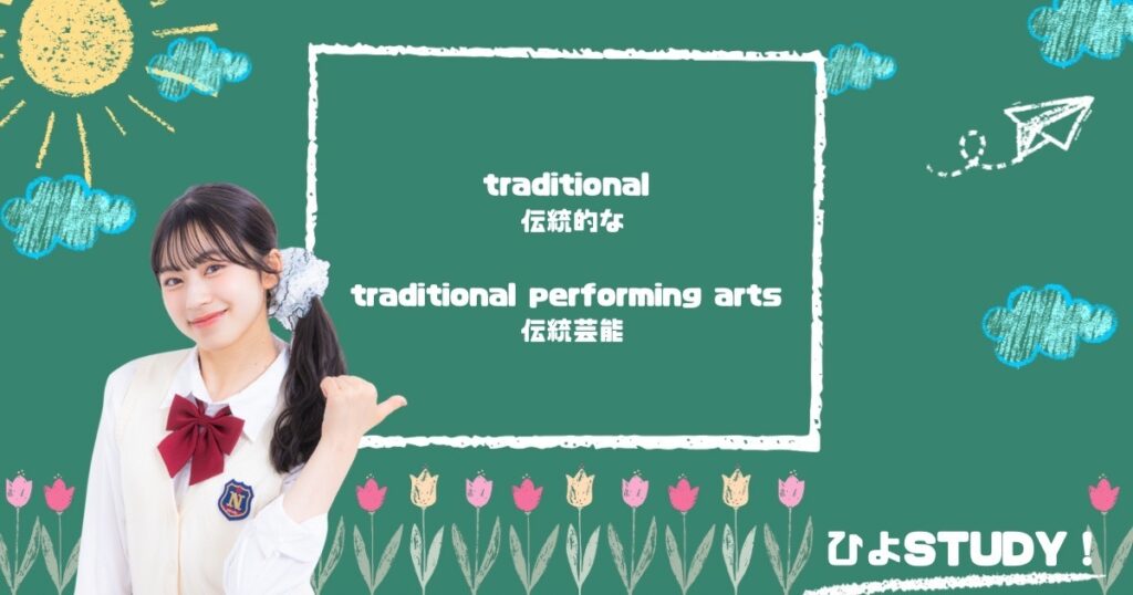 「performing arts」は「舞台芸術」という意味で、音楽、ダンス、演劇など人が演じる芸術全般を指す言葉。例えば、日本の伝統芸能には歌舞伎(Kabuki)、能(Noh)、文楽(Bunraku)などがあり、これらはすべて「traditional performing arts」に含まれるよ♪