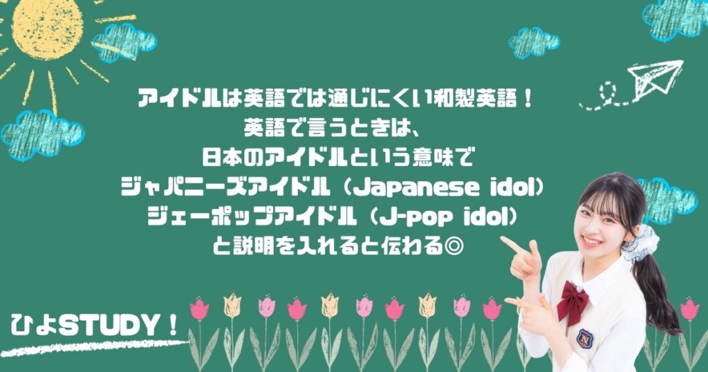 英語で言うときは、日本のアイドルという意味でジャパニーズアイドル(Japanese idol)、ジェーポップアイドル(J-pop idol)と説明を入れると伝わる◎一言で言うならpop starやsinger、artistの方が自然だよ♡