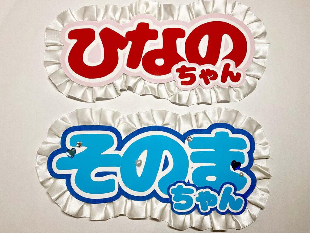 アイビスペイントでデザインしたものを印刷してレースやビーズなどのパーツをつけてミニネームボードを作った!色は推しのメンバーカラーでパーツやイラストも推しのイメージに合わせた!(高1)