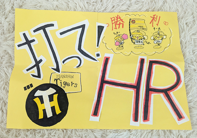 野球が好きで阪神タイガースが箱推しです!!阪神らしい黄色と阪神のキャラクターとホームランを打ってほしいっていうのが伝わるように黒字、赤字で目立つようにしました!(中1)