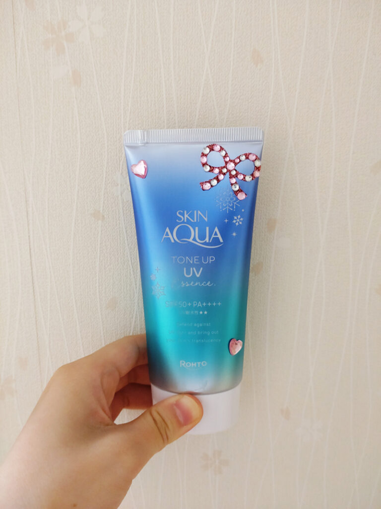 「みんな持ってるスキンアクアの新作日焼け止めです♪これは前にnicolaのバレパイベでデコをしたときの日焼け止めです!今年の夏はこの日焼け止めで生き抜きます!!」(高1)