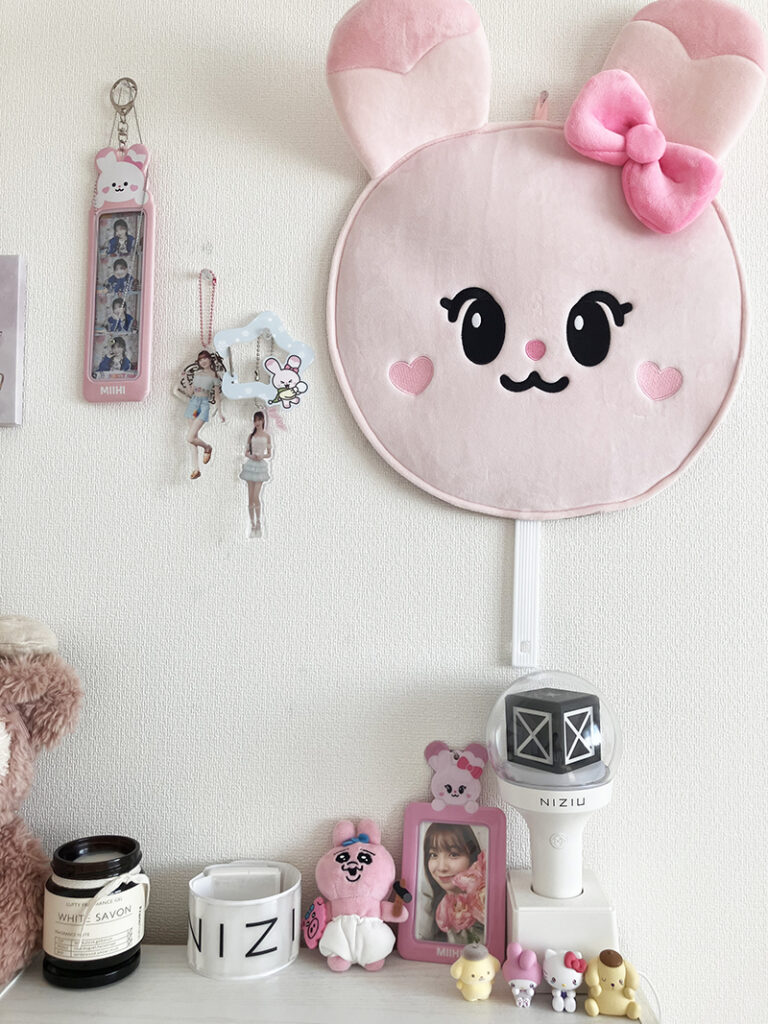 壁に推しのキーホルダーやうちわを飾っているところがポイントです♡(中1)