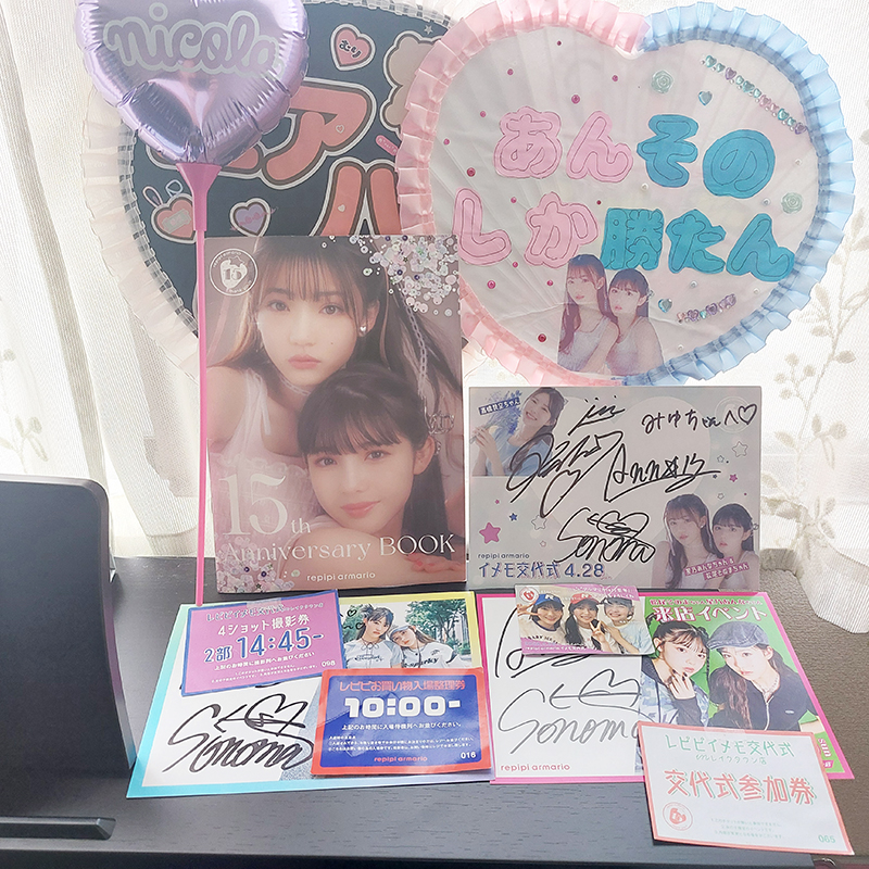 大好きな推し友ちゃんから貰ったグッズや、自分で作ったグッズ、買ったグッズを並べて幸せな空間に♡中でもサイン入りは特に見やすい所に置いてる♪(中3)