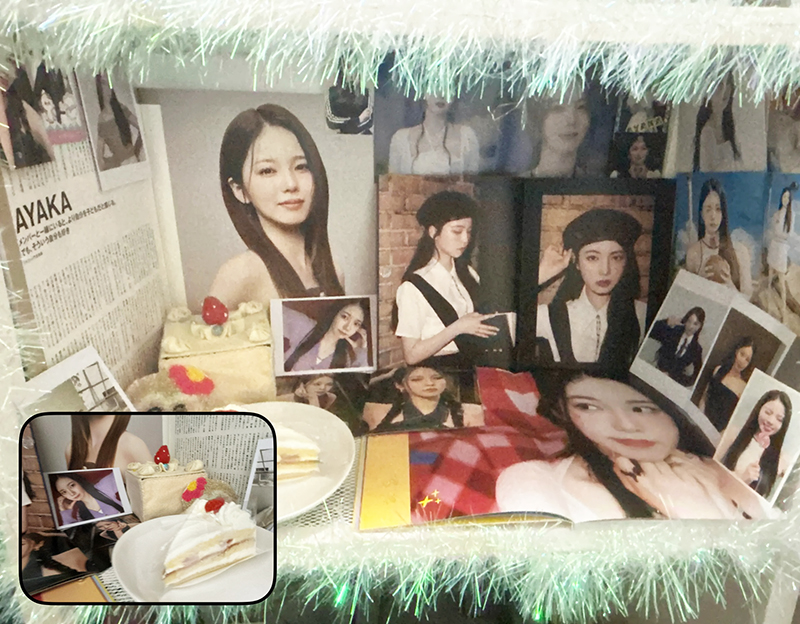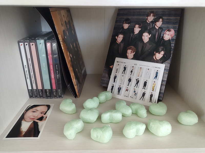特に推してる二人の顔がよく見えるようにする!NiziUのMAYAちゃん色の緩衝材を持ってないから、SnowMan阿部亮平くん色の緩衝材で華やかにしてる!(中2)