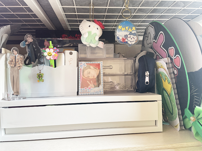 推しの名前のキーホルダーや、アクスタ、グッズ全般を収納!自分にとって幸せになれるスペースにしています♡勉強机の近くに置いて勉強にやる気を出させてます!(小6)
