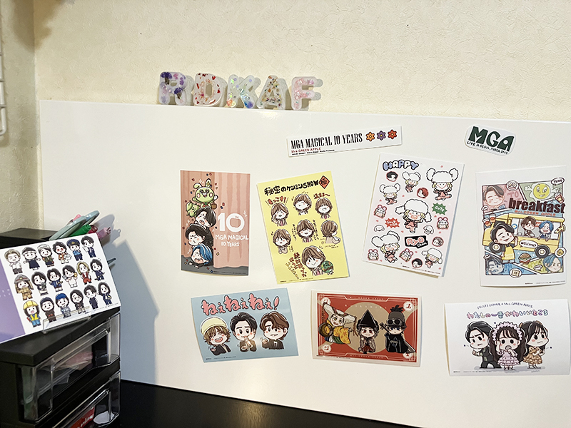 ホワイトボードに絵師さんのネップリを貼って、上にはレジンで作った曲イメージのアルファベットを飾る!(中1)