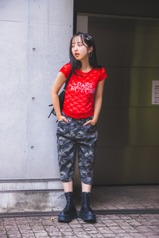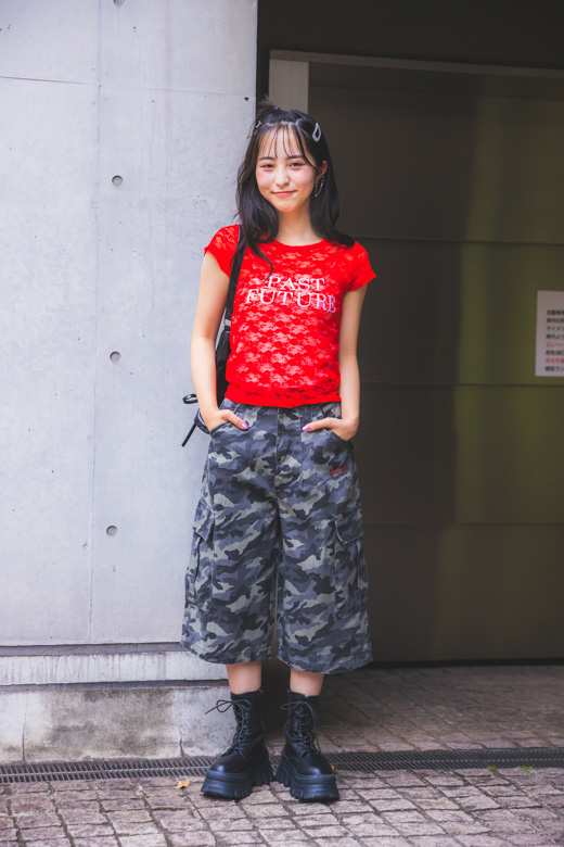 トレンドのレースは、トップスで主役として見せたい!差し色になる赤なら、夏休みに友だちと写真撮るときにも映えるよね♡私がハーフパンツ選ぶって珍しいしシンプルな柄は多分履かないけど、カモ柄はかわいいからチャレンジしたいなって。顔周りのアクセはブレずにシルバー!ブルベだから!バッグとブーツは黒で合わせて、がっつりトップスを目立たせる!
