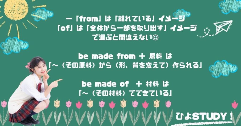 「習ったことあるけど間違いやすいよね!fromが原料、ofが材料って覚えてる~☆あとは問題文をよく読むことがめっちゃだいじ!」