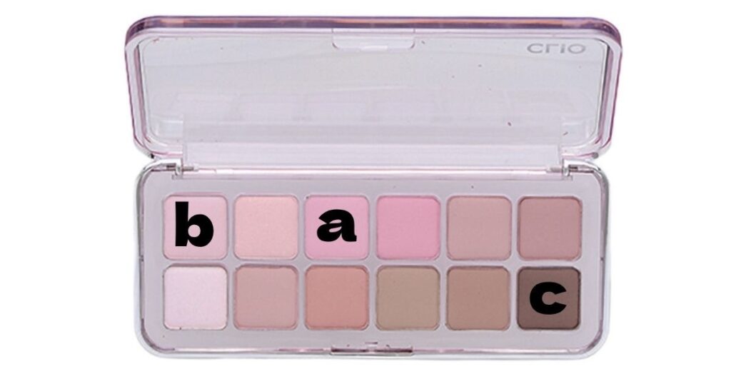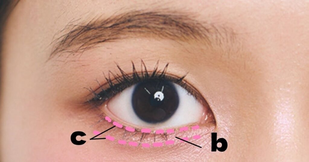 ② <下まぶた> 白っぽピンクのbを涙袋全体に、ブラウンcで涙袋の影ラインを作るよ。さらにcで下まつ毛の間を埋めるように。