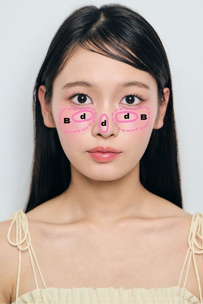 ③<チーク・ハイライト>チークBを指に取り、ほおの中央から広めにぼかす感じでトントン!dハイライトを鼻先とほおの高い部分に重ねづけ!