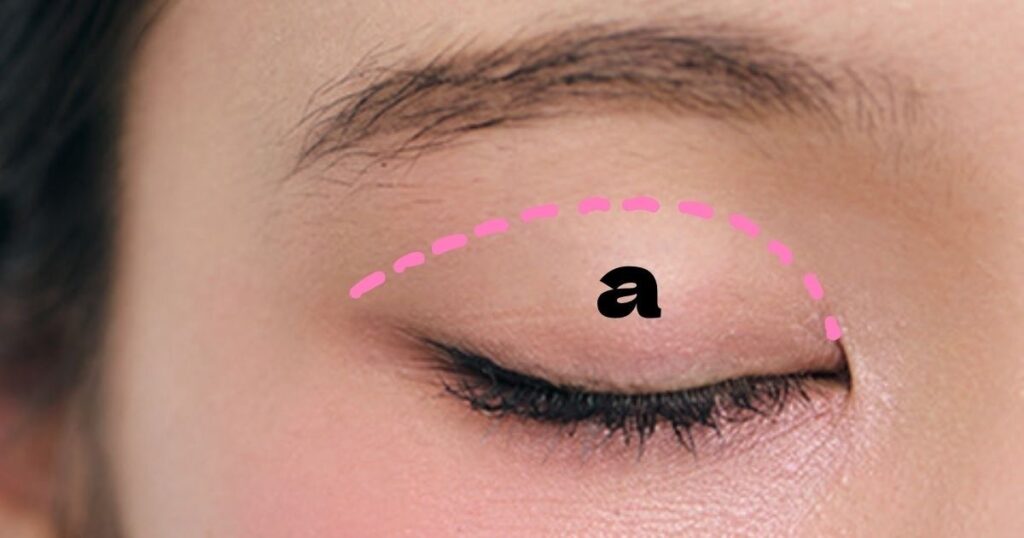① <上まぶた> Aアイシャドウの中の青みの淡ピンクaをアイホール全体に広げるよ。目元はマットで!